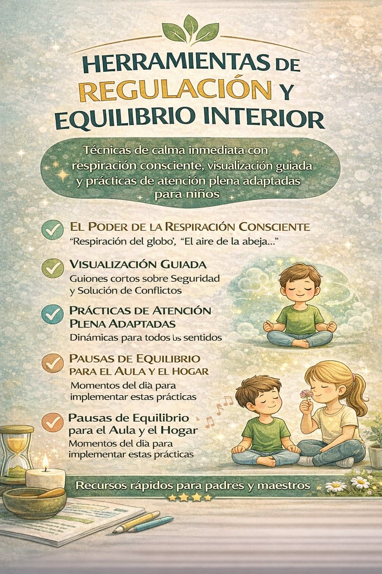Herramientas de Regulación y Equilibrio Interior: Técnicas de calma inmediata con respiración consciente, visualización guiada y prácticas de atención plena adaptadas para niños.